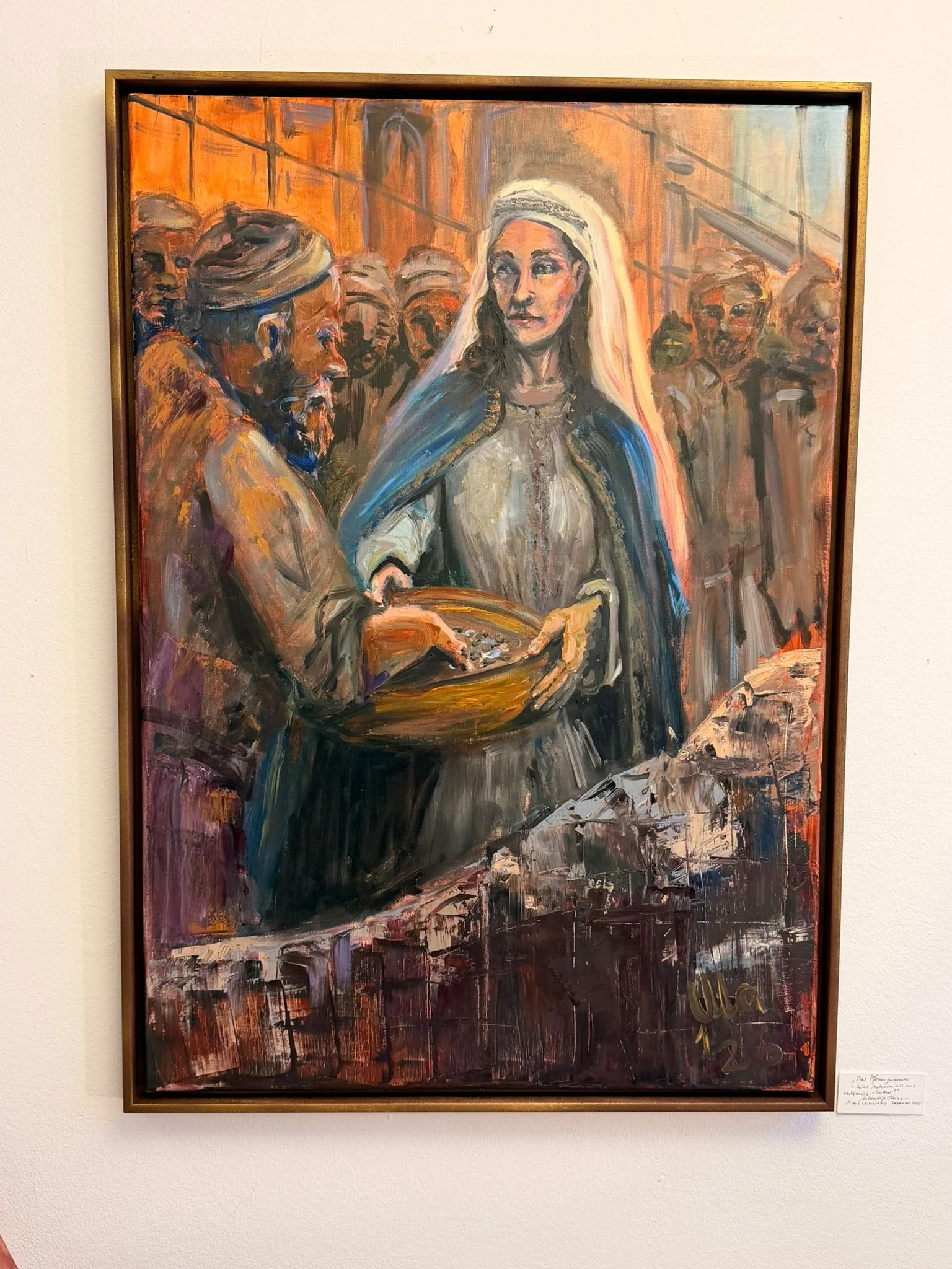 Öl, unter anderem selbst angeriebene Ölfarbe aus Erdpigmenten auf echt Leinen, in farblich passendem dezentem Schattenfugenrahmen.