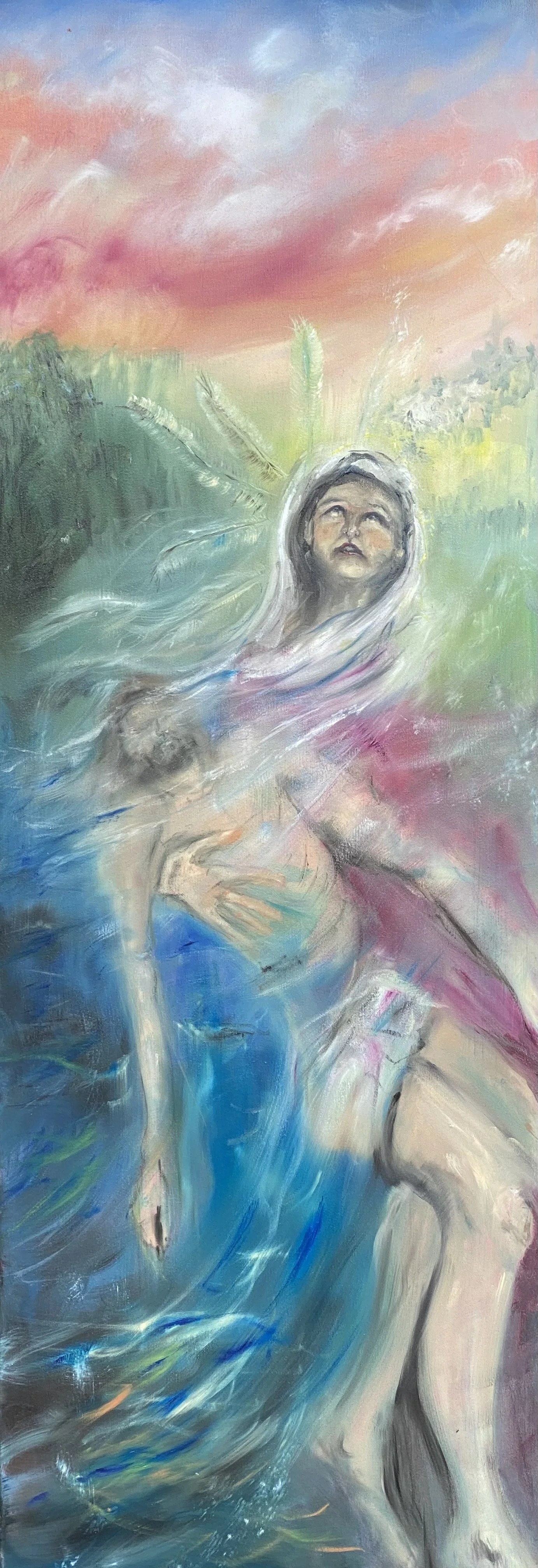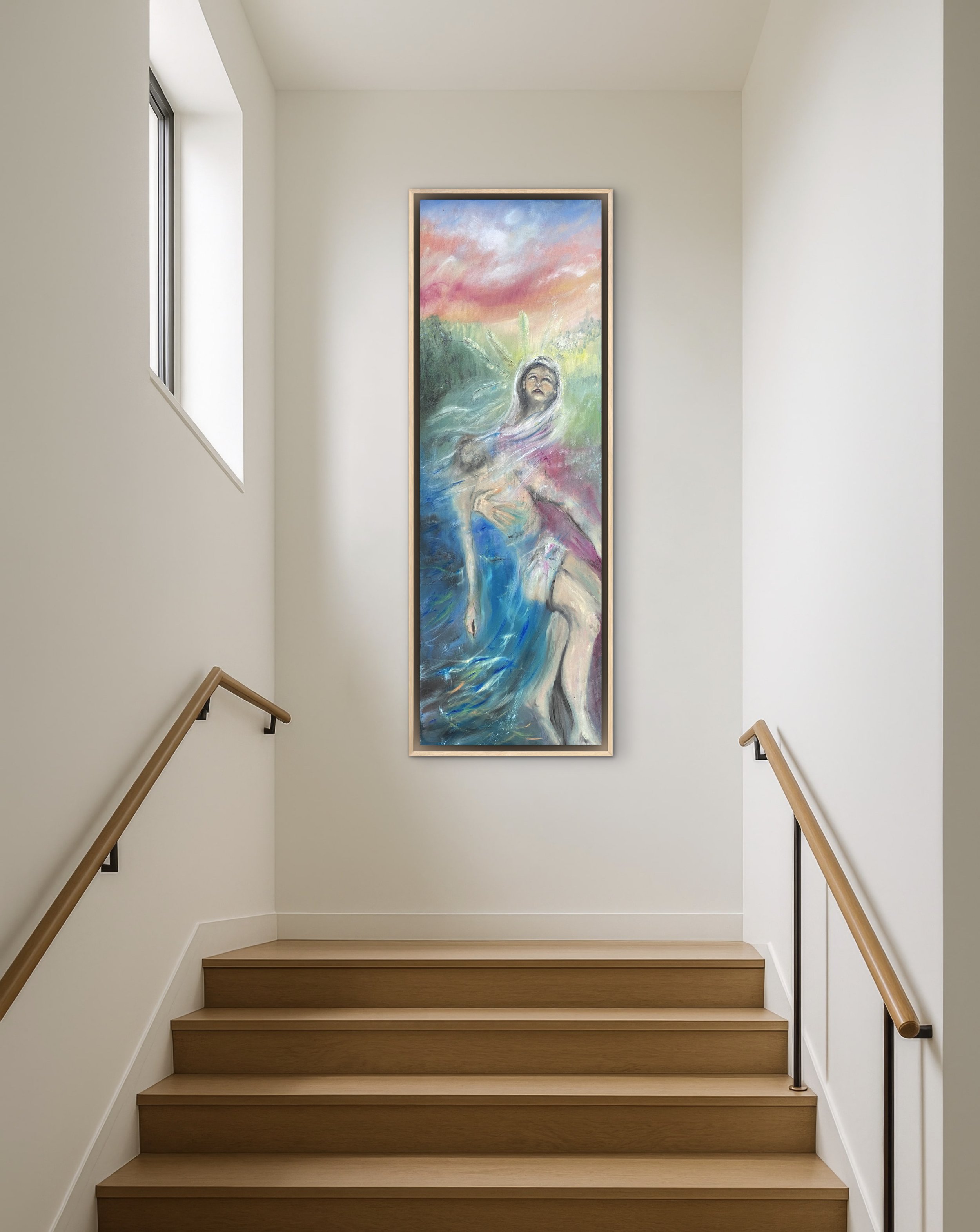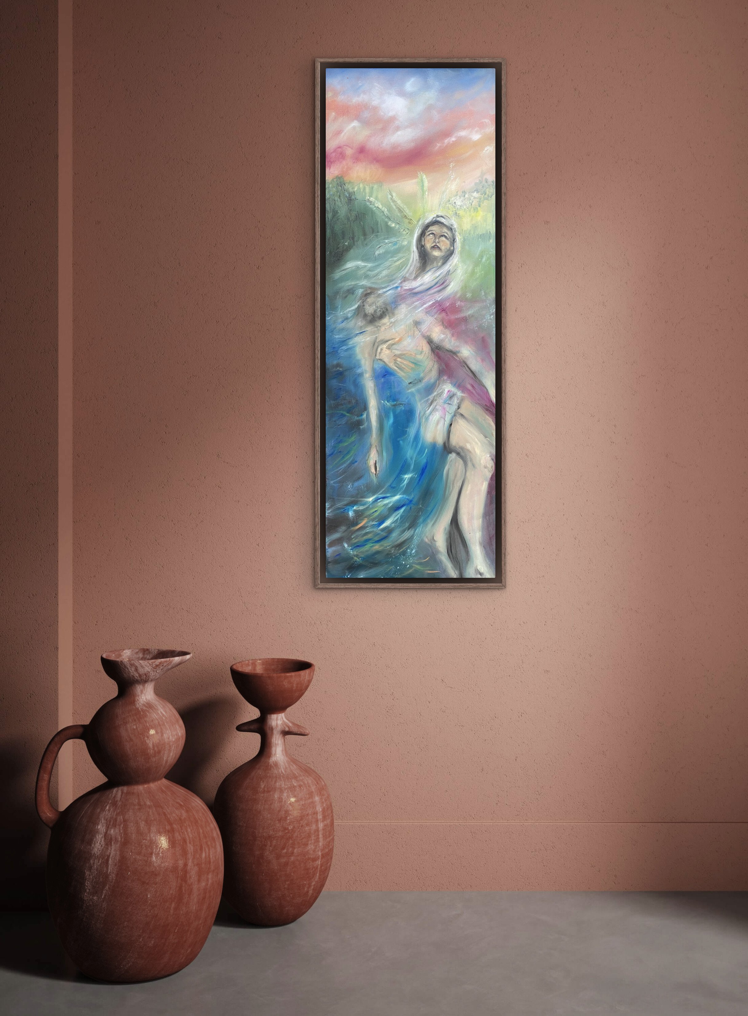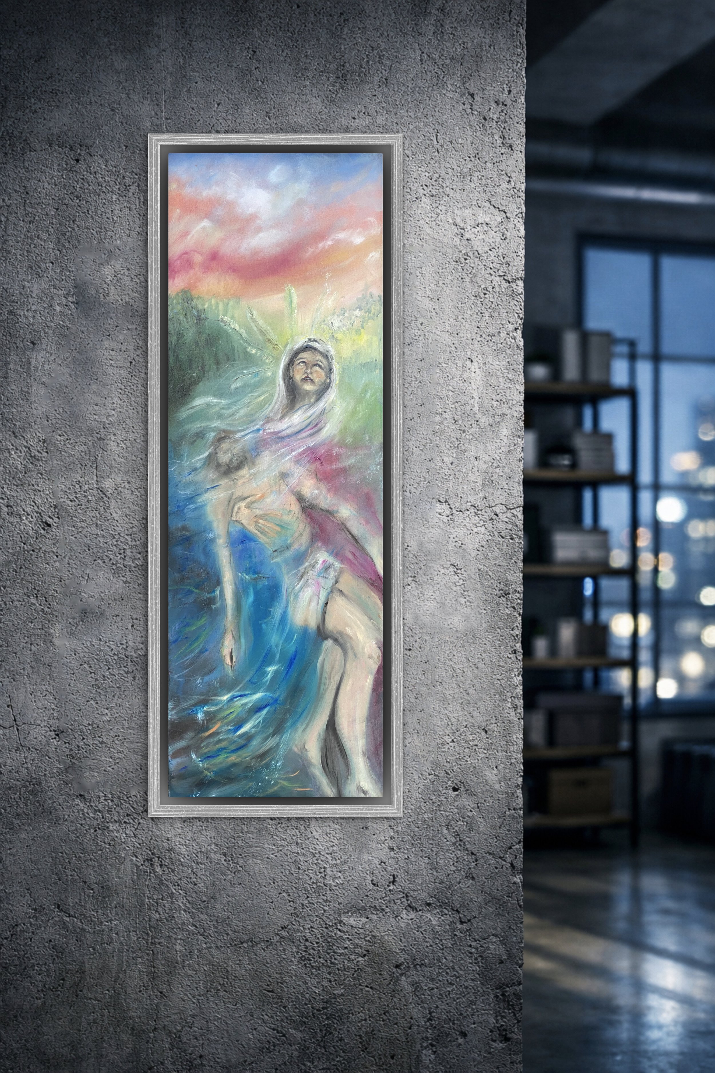 Dieses Bild mit seinen extremen Maßen ist eine Herausforderung zunächst für jedes Bildschirmformat. Beim Original “Christophorus” findet das Auge bei näherer Betrachtung eine Art Kräftigungsübung fürs Gemüt. Man richtet sich auf und schaut gen Himmel, der sich so riesig und rosig sich über der Szene wölbt, dass man sich trotz der eigenen Winzigkeit und Schwäche geborgen fühlen kann. Es passt sehr gut in Dielen, neben Türen, in jede Art Ein- und Durchgang. Als Einzelkunstwerk bietet es sich regelrecht als Gegenüber an, lässt sich auch gut mit anderen Heiligen aus der Serie kombinieren. Mein Favorit als Kontrast zur kosmischen Weite und der Überfülle an Perspektive wäre "Barbara”, die im Turm der Perspektivlosigkeit mit ihrem Kirschzweig trotzt. Weiters passen alle meine Naturdarstellungen, vor allem Wasser-Bilder zu “Christophorus”. Einen Rahmen hat er eigentlich nicht nötig, kann aber auch den noch auf seine Schultern nehmen, wenn gewünscht.