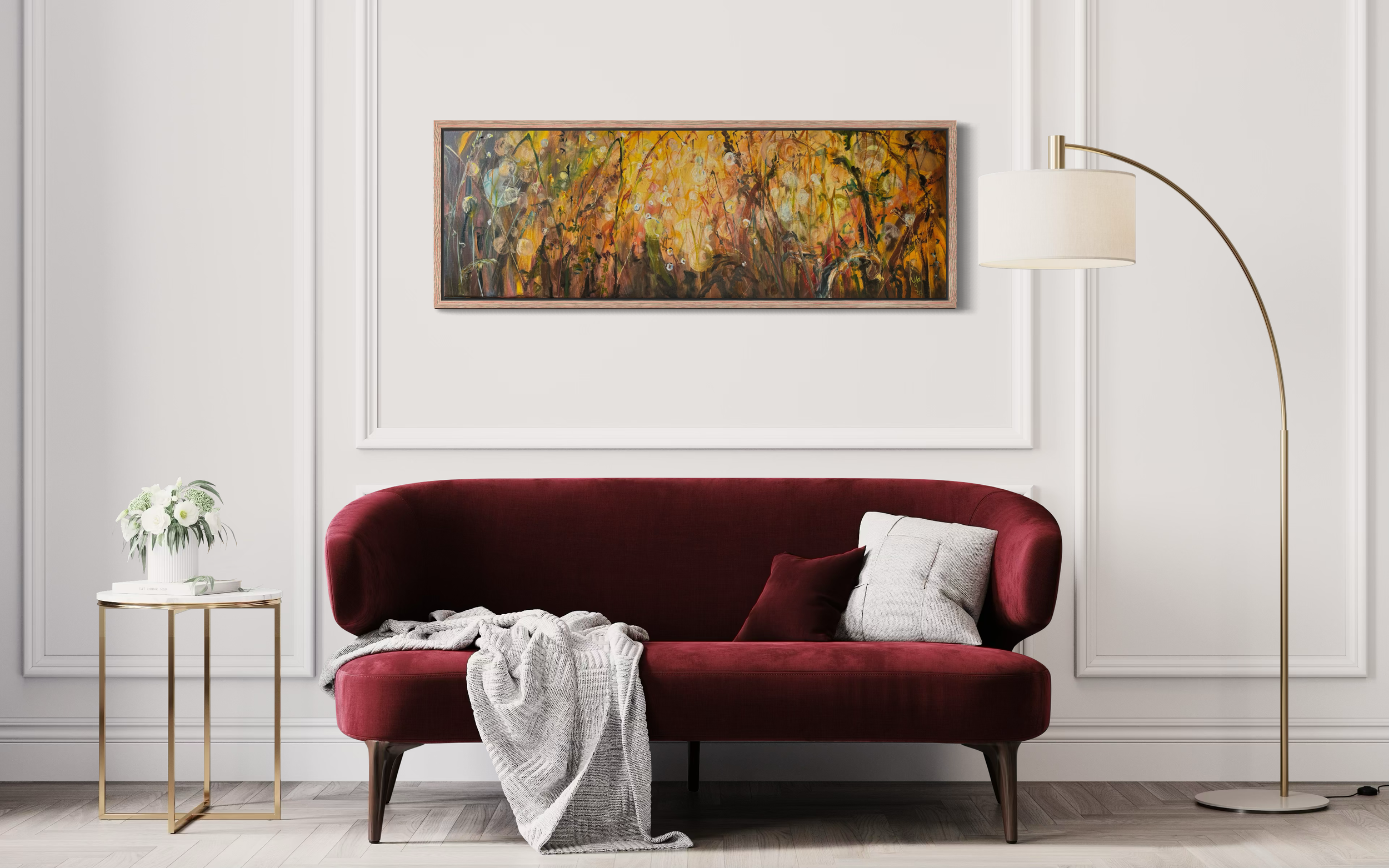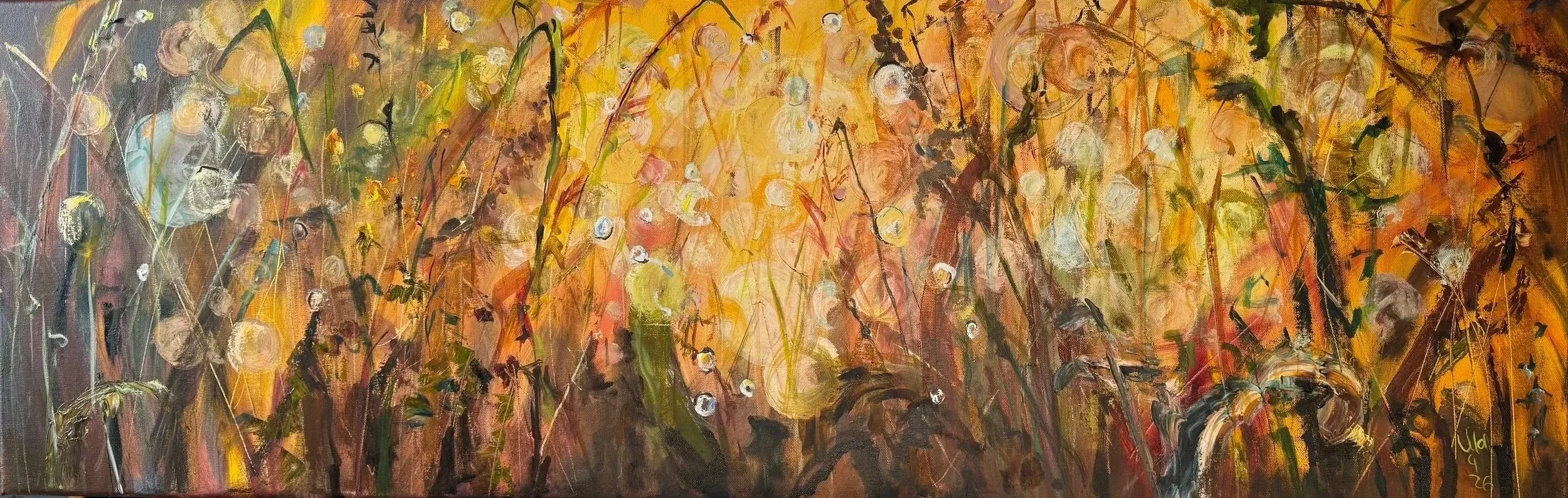 Die Sinneseindrücke, die man kurz nach Sonnenaufgang auf einer Wiese hat, gehen weit über die optisch erfahrbare Realität hinaus und können einen regelrecht mit Glücksgefühlen überfluten. Das millionenfache Gefunkel von Tautropfen, die im Gegenlicht auf frischen Halmspitzen und Blättern tanzen, ist eine Sinfonie für die Seele. Immer wieder kommen diese Perlenfunde in meinen Bildern vor und bringen meine Seele mit dem Kostbarsten des Lebens in Berührung: der augenblicklichen Freude am Dasein. Diese Arbeit im ungewöhnlichen Querformat fängt in dünnen, teils transparenten aufwändig übereinander gespachtelten Schichten so einen Augenblick ein. Energetisierend, lebendig und im Chaos sich der höheren Ordnung hingebend. harmonische Farben, fein aufeinander abgestimmt, impulsiver Duktus und belebende Kontraste machen dieses Gemälde zu einem Dimensionstor im Mikrokosmos.