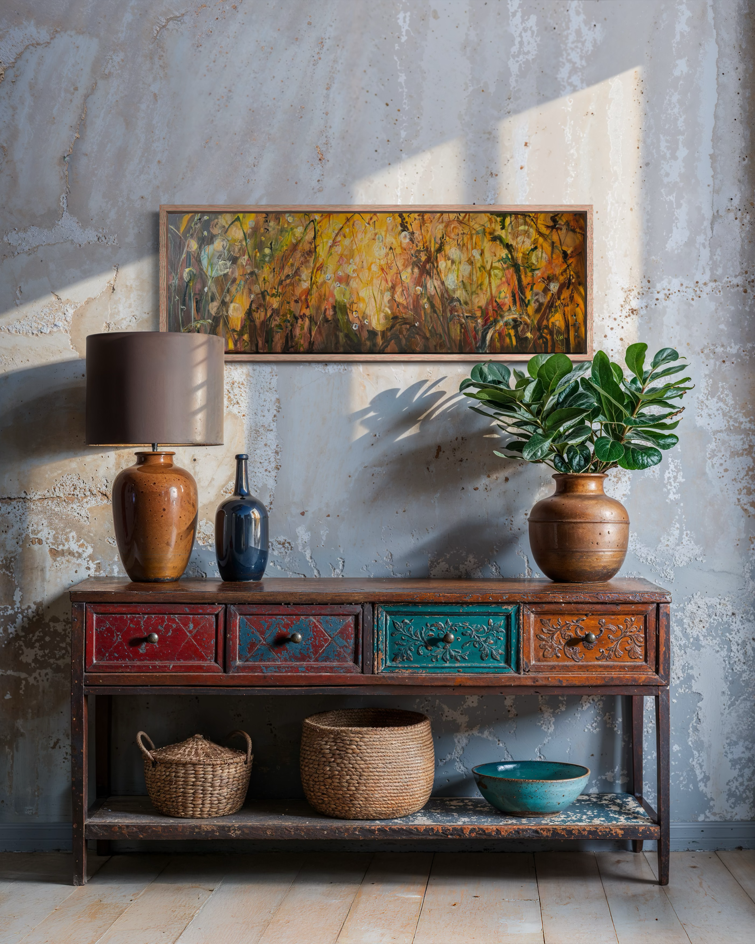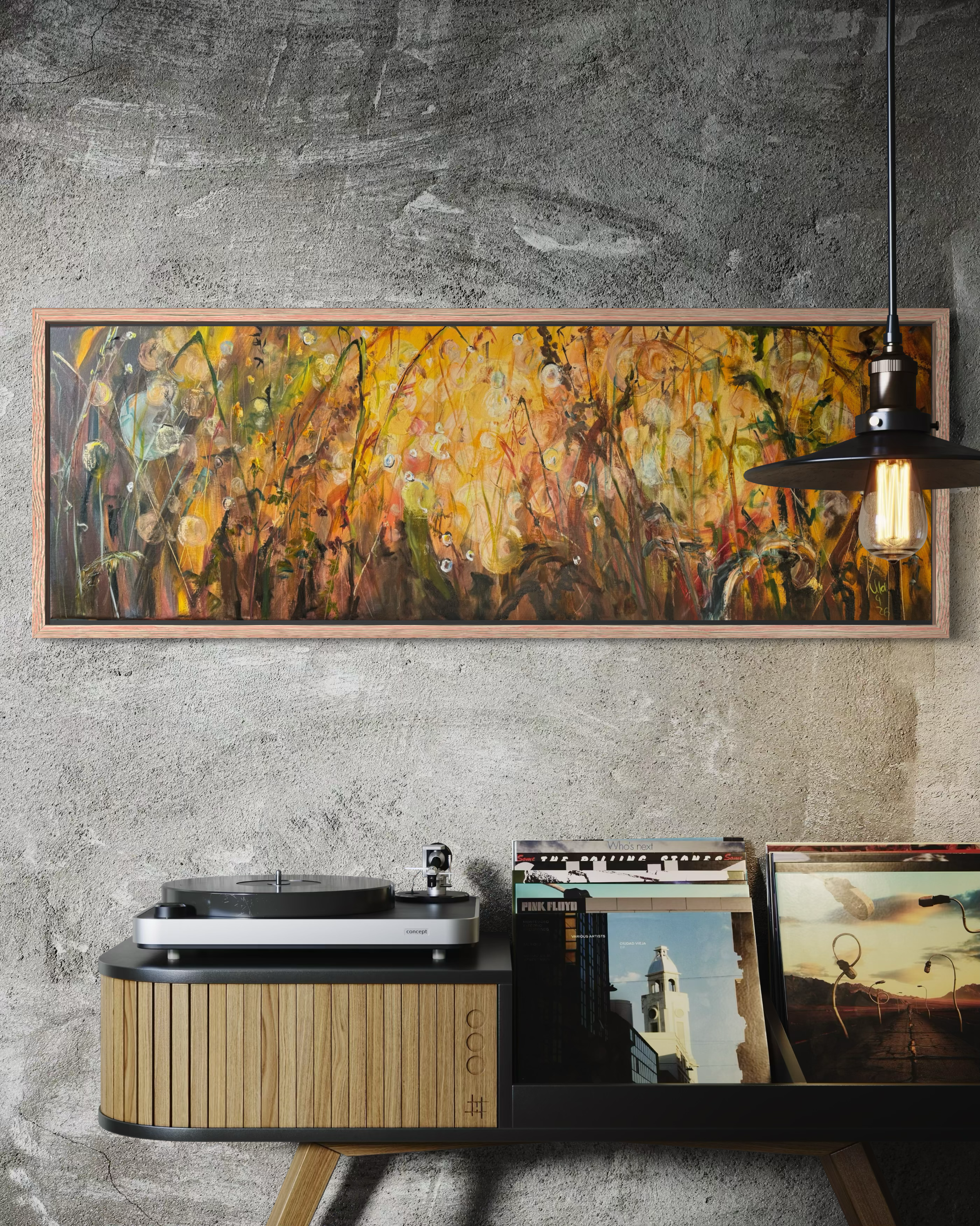 Der Blick bleibt in Bewegung, weil das Bild sich mit Abstand und Lichtsituation verändert.Besonders stimmig wirkt es in Räumen mit natürlichen Materialien und ruhiger Grundhaltung: