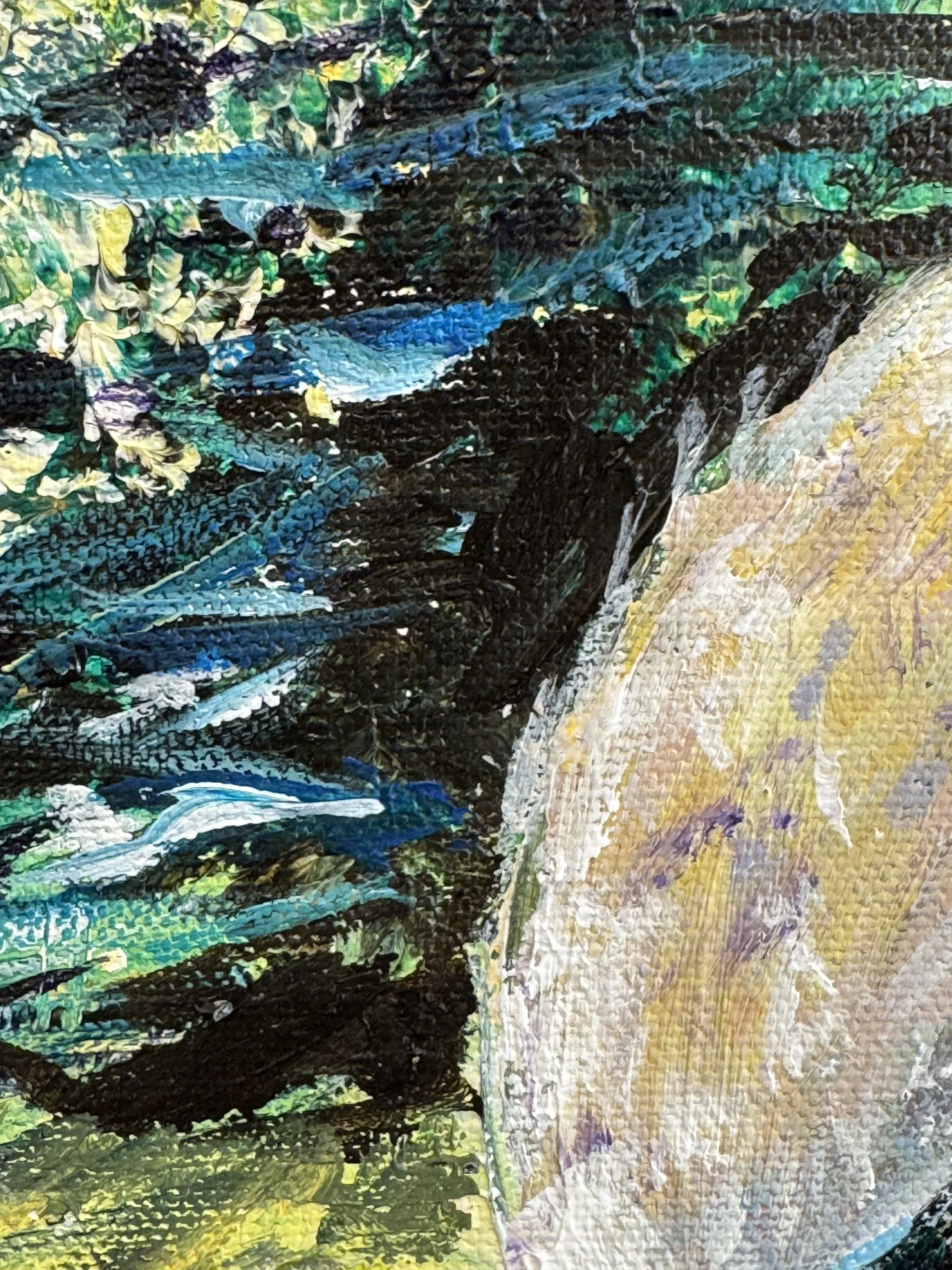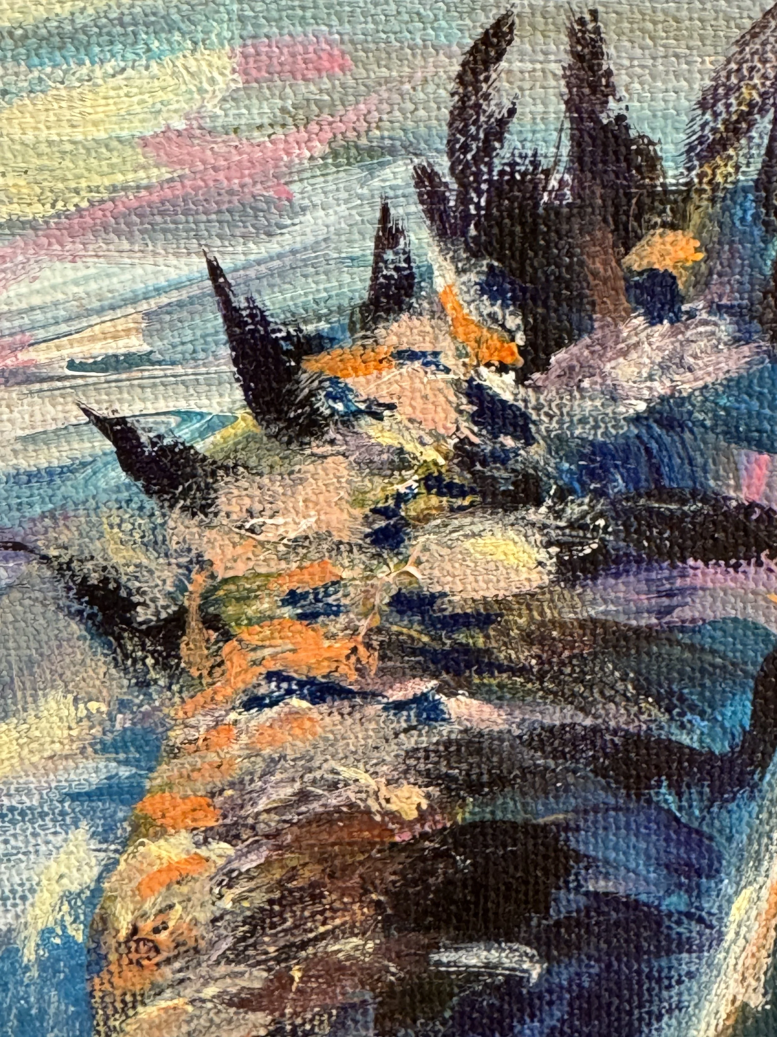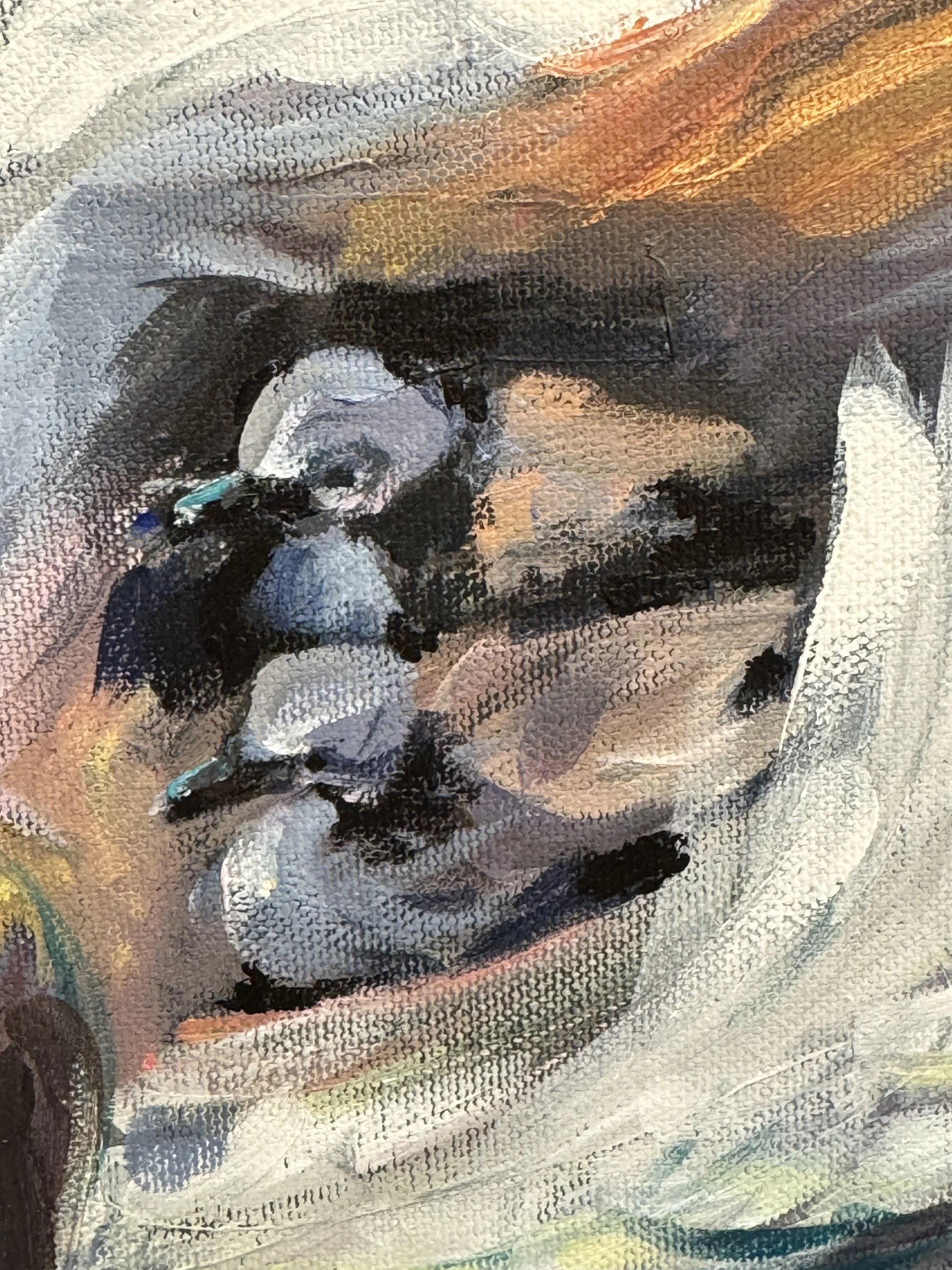Er schaut uns an: offen, neugierig, fast schelmisch. Ein Bild für das Unerwartete, das uns nicht erschrecken will. Funfact: keine schwarze Farbe wurde in diesem Bild verwendet.