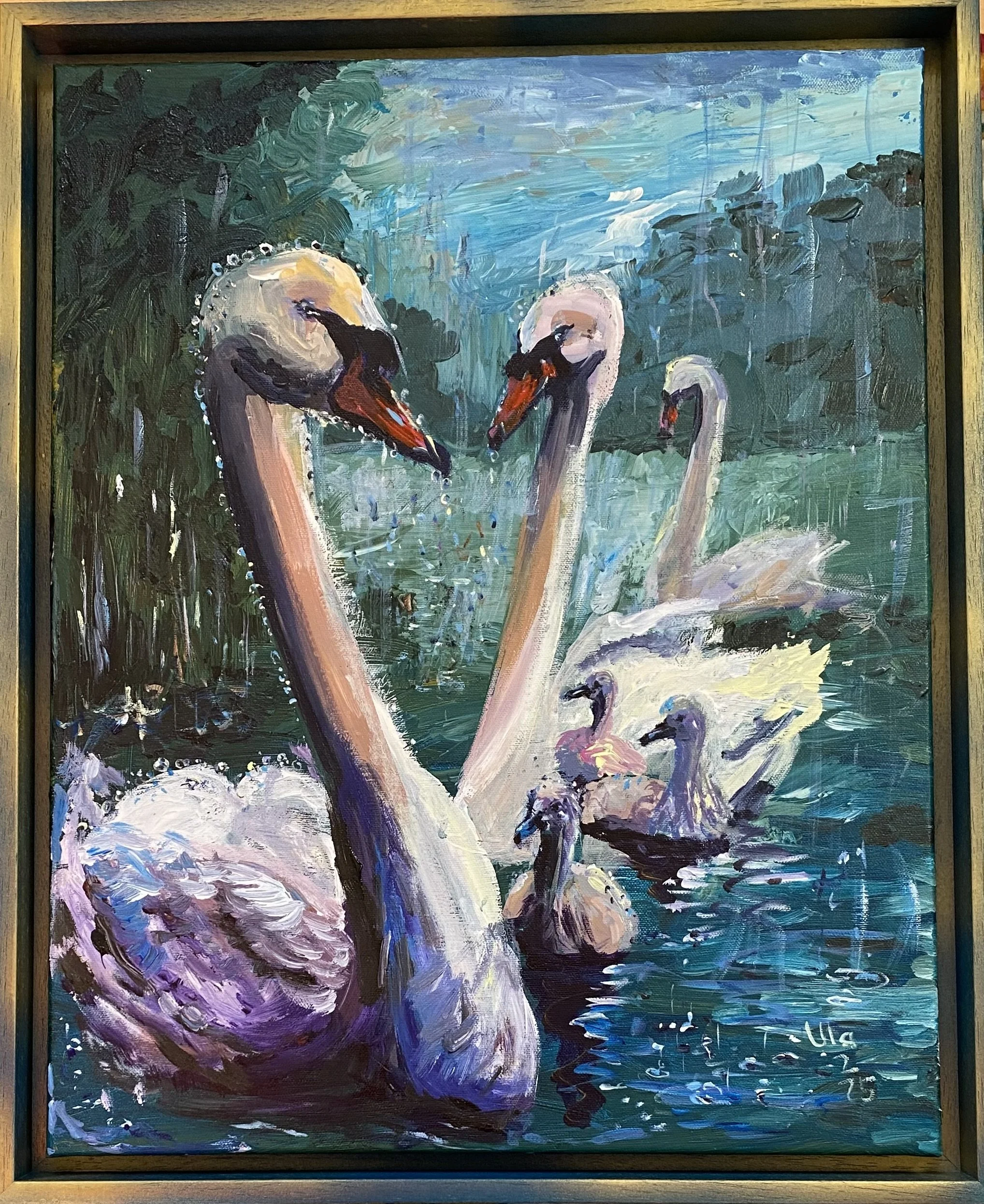 Die Schwäne, groß und wachsam – und dazwischen ihre Jungen, eingetaucht in Licht und Tropfen.